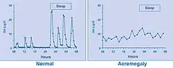 Frequent serum GH measurements in normal subjects (left panel) demonstrate that GH can fluctuate between undetectable levels most of the time interspersed with peaks of up to 30 μg/L (90 mIU/L); in acromegaly (right panel) GH hypersecretion is continuous with no undetectable levels.