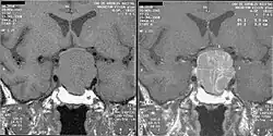 An MRI of the brain focusing on the sella turcica after gadolinium administration allows for clear delineation of the pituitary and the hypothalamus and the location of the tumor.