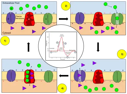 Action potentials are generated by special types of voltage-gated ion channels embedded in a cell's plasma membrane.[b] These channels are shut when the membrane potential is near the (negative) resting potential of the cell, but they rapidly begin to open if the membrane potential increases to a precisely defined threshold voltage, "depolarising" the membrane.[b] When the channels open, they allow an inward flow of sodium ions, which makes the interior of the cell more positive, which further raises the (negative) membrane potential. This then causes more channels to open, producing a greater electric current across the cell membrane and so on. The process proceeds explosively until all of the available ion channels are open, resulting in a large upswing in the membrane potential. The rapid influx of sodium ions causes the polarity of (i.e. the direction of the electric field across) the plasma membrane to reverse, and the ion channels then rapidly inactivate. As the sodium channels close, sodium ions can no longer enter the neuron, and they are then actively transported back out of the plasma membrane. Potassium channels are then activated, and there is an outward current of potassium ions, returning the electrochemical gradient to the resting state. Because few ions need to pass through to change the potential, the concentrations of ions on either side remain relatively unchanged during this process. After an action potential has occurred, there is a transient negative shift, called the afterhyperpolarization.