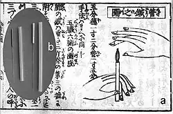 Apart from the usual filiform needle, other needle types include three-edged needles and the Nine Ancient Needles.[47] Japanese acupuncturists use extremely thin needles that are used superficially, sometimes without penetrating the skin, and surrounded by a guide tube (a 17th-century invention adopted in China and the West). Korean acupuncture uses copper needles and has a greater focus on the hand.[36]