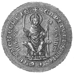 The significance of the cult of St. Adalbert began to grow as the archbishops of Magdeburg increasingly asserted their claims to authority over the Polish ecclesiastical province. Bolesław the Wrymouth minted bracteates bearing the image of the saint.[43] Bishop Otto of Bamberg, who led a Christianization mission in Pomerania with the duke's support, dedicated churches to St. Adalbert in Szczecin and Wolin. In 1127, the head of St. Adalbert was discovered in the Gniezno Cathedral. Several years later, in 1143, the bishop of Prague, Otto, likewise declared the discovery of the saint's head in the Prague Cathedral.[45]