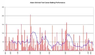 From the time of his debut up to the 2003 World Cup, Gilchrist's played in 40 Tests in series. With the exception of the 2001 tour of India, when he averaged 24.80 (he made 124 runs in the series; 122 of them came in one innings), his performances with the bat were such that he was described at the time as the "finest batsman-wicketkeeper to have graced the game".[130] At one point in March 2002, Gilchrist's Test average was over 60; the second-highest for any established player in Test history,[131] and he topped the ICC Test batting rankings in May 2002.[132]