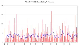 Gilchrist was renowned for walking when he considered himself to be out, sometimes contrary to the decision of the umpire.[8][9] He made his first-class debut in 1992, his first One-Day International appearance in 1996 in India and his Test debut in 1999.[1] During his career, he played for Australia in 96 Test matches and over 270 One-day internationals. He was Australia's regular vice-captain in both forms of the game, captaining the team when regular captains Steve Waugh and Ricky Ponting were unavailable. He retired from international cricket in March 2008, though he continued to play domestic tournaments until 2013.
