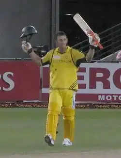 Gilchrist signed a short-term contract in November 2009 to play Twenty20 cricket for Middlesex County Cricket Club in England during 2010.[49] He was appointed interim captain of the T20 side on 11 June following the sudden resignation of Shaun Udal.[50][51] He played in seven matches for the side during the 2010 Twenty20 Cup, scoring 212 runs at an average of 30.28,[47][52] including a century made against Kent at Canterbury,[53] as well as captaining the county against the touring Australians in a one-day match ahead of their ODI series against England.[54] The season was Gilchrist's only one spent playing county cricket.