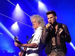 Lambert started touring with Roger Taylor and Brian May of Queen in June 2014, with 35 dates in North America, Korea, Japan, Australia and New Zealand. The Queen + Adam Lambert Tour 2014–2015 was a critical and commercial success, as reviews highlighted the musical virtuosity of May and Taylor, alongside Lambert's impressive vocal dexterity, charisma and affinity with Queen's repertoire – all augmented by the elaborate spectacle of the production.[122] In 2015, a second leg of eleven countries and 26 dates in Europe and the UK was performed.[123] On November 4, Queen + Adam Lambert was named Band of the Year at the 10th annual Classic Rock Roll of Honour Awards.[124] Following a much reviewed "soaring" performance on the UK's The X Factor,[125] Lambert and Queen presented an exclusive New Year's Eve concert in London at Central Hall Westminster, Queen + Adam Lambert Rock Big Ben Live. The praised concert was called "pitch-perfect".[126] In January, Queen + Adam Lambert appeared on the cover of Classic Rock magazine; he was applauded in the cover story by Taylor and May, who called him "a gift from god."[127] In September, Queen and Lambert headlined Rock in Rio's "30 Years Celebration" in Brazil, as part of a six date South American tour.[128] The tour was a critical success; and their Rock in Rio performance was the seven-day festival's most popular, based on ticket sales.[129]