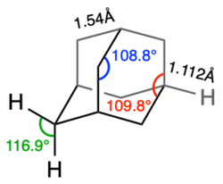 As deduced by electron diffraction and X-ray crystallography, the molecule has Td symmetry. The carbon–carbon bond lengths are 1.54 Å, almost identical to that of diamond. The carbon–hydrogen distances are 1.112 Å.[3]