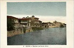 The Ottomans terminated the Ramadanid administration in 1608 after the Celali rebellions and began direct rule from Constantinople through an appointed Vali.[25] In late 1832, the Vali of Egypt, Muhammad Ali Pasha, invaded Syria, and reached Cilicia. The Convention of Kütahya signed on 14 May 1833 ceded Cilicia to the de facto independent Egypt. At that time, the Sanjak of Adana's population of 68,934 had hardly any urban services.[26] The first neighbourhood (Verâ-yı Cisr) east of the river was founded and Alawites were brought from Syria to work in the flourishing agricultural lands. İbrahim Paşa, the son of Muhammad Ali Paşa, demolished Adana Castle and the city walls in 1836. He built the first canals for irrigation and transportation and also built a water system for the residential areas of the town, including wheels that raised the water of the river for public fountains.[27] After the Oriental crisis, the Convention of Alexandria signed on 27 November 1840 required the return of Cilicia to Ottoman sovereignty.