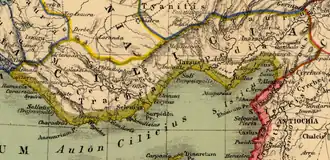 Alexander the Great entered Cilicia through the Cilician Gates in 333 BC. After defeating the Persians at the Battle of Issus, he installed his own satrap, Balacrus, to oversee the region's administration.[3] His death in 323 BC marked the beginning of the Hellenistic era, as Greek replaced Luwian as the language of the region. After a short time under Ptolemaic dominion, the Seleucid Empire took control of the region in 312 BC. Adanan locals adopted a Greek name - Antioch on Sarus - for the city to demonstrate their loyalty to the Seleucid dynasty. The adopted name and the motifs illustrating the personification of the city seated above the river-god Sarus on the city's coins, suggest a special appreciation of the rivers which were a strong part of the Cilician identity.[14] The Seleucids ruled Adana for more than two centuries until they were weakened by a civil war which led them to offer allegiance to Tigranes II, the King of Armenia who conquered a vast part of the Levant. Cilicia became a vassal state of the Kingdom of Armenia in 83 BC and new settlements were founded by Armenians in the region.[15]
