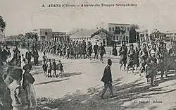 After a week of silence, 850 soldiers from regiments of the Ottoman Army arrived in the city on April 25. Shots were fired at the campground and a rumour immediately spread that the Armenians had opened fire from a church tower. Without even investigating the rumour, the military commander Mustafa Remzi Pasha directed soldiers and bashi-bazouks towards the Armenian quarters and for three days they shot people, destroyed buildings and burned down Christian neighbourhoods. The pogroms of 25–27 April were on a much greater scale than the clashes of 14–17 April, and almost all the casualties were Christian.[30]