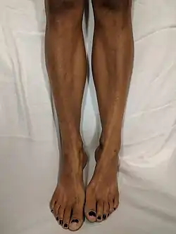 | Darkening of the skin seen on the legs of an otherwise pale-skinned patient | |
