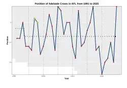 The Crows were formed in 1990 as the de facto state team representing South Australia in the AFL. They were originally owned by the South Australian National Football League (SANFL), though they gained administrative independence in 2014.[5] They played their first season in 1991 and finished in 9th place, the highest ranking of any expansion club in the AFL in a debut year.[6][7] The men's team won both the 1997 and 1998 grand finals, and have appeared in 15 finals series in their 33-year history. Adelaide is the most successful team in the AFL Women's competition, and is one of two clubs (the other being Brisbane) that have won multiple premierships; winning in 2017, 2019 and 2022 (S6). It also fields a reserves team in the South Australian National Football League (SANFL), along with the other South Australian football team in the Port Adelaide Football Club.
