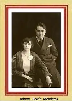 Adnan Menderes was born in 1899 in Koçarlı, Aydın, as a son of a wealthy landowner of Crimean Tatar origin.[2] After primary school, Menderes attended the American College in İzmir.[3] He fought against the invading Greek army during the Turkish War of Independence and was awarded a medal of honour.[4] He graduated from the Ankara University Law School. In 1930, Adnan Menderes organized a branch of the short-lived Liberal Republican Party (Turkish: Serbest Cumhuriyet Fırkası) in Aydın.[5] After the party dissolved itself, he was invited by Atatürk himself to join the ruling Republican People's Party and was selected by the party leaders as a deputy of Aydın in 1931. In 1945, he was expelled from the party with two other colleagues due to inner-party opposition to the nationalization policies of İsmet İnönü.