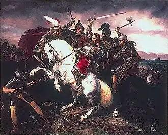 Adolf (c. 1255 – 2 July 1298) was the count of Nassau from about 1276 and the elected king of Germany from 1292 until his deposition by the prince-electors in 1298.[1][2] He was never crowned by the pope, which would have secured him the imperial title. He was the first physically and mentally healthy ruler of the Holy Roman Empire ever to be deposed without a papal excommunication. Adolf died shortly afterwards in the Battle of Göllheim fighting against his successor Albert of Habsburg.