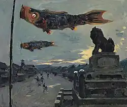 In 1885, Charles J. S. Makin used some of Farsari's views to illustrate his travel account Land of the Rising Sun, Being a Short Account of Japan and the Japanese.[29] As photomechanical printing was still in its infancy, it was common for artists and illustrators to create works derived from photographs. For example, Charles Wirgman's numerous engravings for the Illustrated London News were made from views by Wirgman's friend and sometime partner Felice Beato. Occasionally the link between a work of art and its photographic source material was less overt: Louis-Jules Dumoulin's 1888 oil painting Boys' Festival from the Bluff, Yokohama [sic] (now called Carp Banners in Kyoto) draws heavily from Farsari's photograph Gionmachi, Kioto (now often called View of Shijō-dōri, Kyoto);[30] although the painted image strongly resembles the photographic source, the location of the subject has been changed in the title.