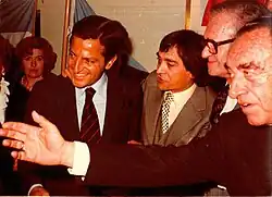 In March 1975, Herrero Tejedor became secretary-general of the Movimiento while Suárez was appointed deputy secretary-general. Herrero Tejedor was considered a likely candidate for prime minister until his death in a car accident in June.[1] In December, shortly after Francisco Franco's death, Suárez was promoted to secretary-general by prime minister Carlos Arias Navarro, and became a member of Arias's cabinet. In the same year, he also became a founding member of the Spanish People's Union (Unión del Pueblo Español, UDPE).[7]