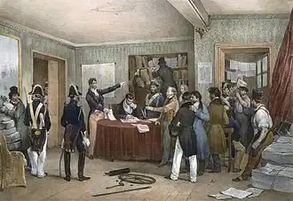 The left opposition declared that they would hold an enormous banquet on the Place de la Madeleine on 22 February. Fearing trouble, Guizot declared the banquet illegal, and ammunition was given to the army garrison, and they prepared for trouble. Thiers, believing that the government was too strong to allow an uprising, advised caution and said he would not attend the banquet.[24] The army commander, Marshal Bugeaud, put squadrons of dragoons on the streets. The day began peacefully, but by midday groups of demonstrators were raising barricades on the Champs-Élysées and hurling rocks at soldiers in front of the Ministry of Foreign Affairs, at the corner of Boulevard des Capucines and rue Cambon. The volunteer members of the Garde Nationale were summoned to support the army, but few turned out. Thiers toured the streets on foot, and was recognized and cheered by many of the demonstrators. The demonstrations resumed on 23 February, under a freezing rain. The King remained calm, telling his sister, "The Parisians never make a Revolution in the winter, and they won't overthrow the Monarchy for a banquet." As the day advanced, the demonstrators raised more barricades and confronted the army. The leaders of many of the National Guard units informed the Prefect of police that they wanted reform and would not support the army against the population. A crowd of 600–800 National Guards threatened to storm the National Assembly building. Thiers addressed them, reminding them that the assembly was democratically elected. The guardsmen stopped their assault, and gave the parliament members a petition demanding reforms.