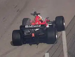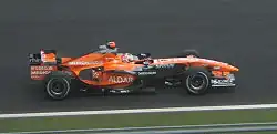 Sutil appeared for the team as the third driver at the European, French and Japanese Grands Prix. By the time of his third appearance, the outfit had been bought by Spyker Cars. At the end of the year, he was promoted to second driver for the 2007 season, having been signed on a multi-year contract by the Spyker MF1 Team.[4] In an interview with the Official Formula One website, Sutil's first 2007 teammate, Christijan Albers, commented that "Adrian is a good driver and he will be quick this year, but as a driver you should always be pushing to the limits without thinking what the guy in the car next to you is doing. But Adrian will be a good team-mate and it looks as though he's going to be a big talent [for the future]".[5]