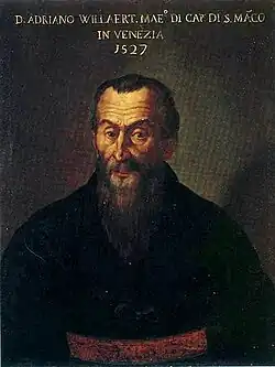Adrian Willaert (c. 1490 – 7 December 1562) was a Flemish composer of High Renaissance music. Mainly active in Italy, he was the founder of the Venetian School.[1] He was one of the most representative members of the generation of northern composers who moved to Italy and transplanted the polyphonic Franco-Flemish style there.[2]