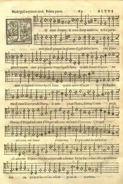 With his contemporaries, Willaert developed the canzone (a form of polyphonic secular song) and ricercare, which were forerunners of modern instrumental forms.[15] Willaert also arranged 22 four-part madrigals for voice and lute written by Verdelot.[16] In an early 4-part vocal work, Quid non-ebrietas? (In some sources called the Chromatic Duo) Willaert uses musica ficta around the circle of 5ths in one of the voices resulting in an augmented 7th in unison with the ending octave, an outstanding experiment with chromatic enharmonicism. Willaert was among the first to extensively use chromaticism in the madrigal.[17] Looking forward, we are given an image of early word painting in his madrigal Mentre che'l cor.[18] Willaert, who was fond of the older compositional techniques such as the canon, often placed the melody in the tenor of his compositions, treating it as a cantus firmus.[19] Willaert, with the help of De Rore, standardized a five-voice setting in madrigal composition.[19] Willaert also pioneered a style that continued until the end of the madrigal period of reflecting the emotional qualities of the text and the meanings of important words as sharply and clearly as possible.[17]