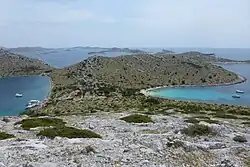 The Adriatic Sea contains more than 1,300 islands and islets, most along the Adriatic's eastern coast—especially in Croatia, with 1,246 counted.[22] The number includes islands, islets, and rocks of all sizes, including ones emerging at ebb tide only.[23] The Croatian islands include the largest—Cres and Krk, each covering about the same area of 405.78 square kilometres (156.67 sq mi)—and the tallest—Brač, whose peak reaches 780 metres (2,560 ft) above sea level. The islands of Cres and the adjacent Lošinj are separated only by a narrow navigable canal dug in the time of classical antiquity;[24] the original single island was known to the Greeks as Apsyrtides.[25] The Croatian islands include 47 permanently inhabited ones, the most populous among them being Krk, Korčula and Brač.[26] The islands along the Adriatic's western (Italian) coast are smaller and less numerous than those along the opposite coast; the best-known ones are the 117 islands on which the city of Venice is built.[27] The northern shore of the Greek island of Corfu also lies in the Adriatic Sea as defined by the IHO.[28] The IHO boundary places the Diapontia Islands (northwest of Corfu) in the Adriatic Sea.[10][29]