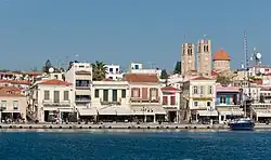 Aegina (/ɪˈdʒaɪnə/;[3] Greek: Αίγινα pronounced [ˈeʝina]; Ancient Greek: Αἴγῑνα)[a] is one of the Saronic Islands of Greece in the Saronic Gulf, 27 km (17 mi) from Athens. Tradition derives the name from Aegina, the mother of the mythological hero Aeacus, who was born on the island and became its king.[4] In classical antiquity Aegina was a powerful city-state and at one point a rival of Athens. In modern times Aegina is known for the temple of Aphaia, pistacho production, and the pilgrimage site of St. Nektarios. Many Athenians have established vacation homes in Aegina.