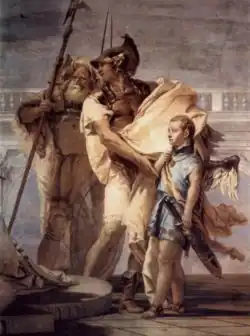 ![]() Iapyx removing an arrowhead from the leg of Aeneas, with Aeneas's son, Ascanius, crying beside him. Antique fresco from Pompeii. | |