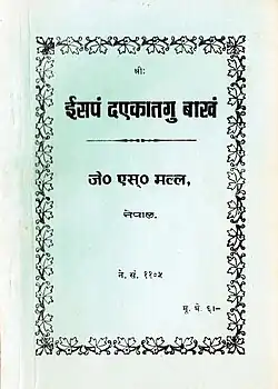 In Burma, which had its own ethical folk tradition based on the Buddhist Jataka Tales, the joint Pali and Burmese language translation of Aesop's fables was published in 1880 from Rangoon by the American Missionary Press.[46] Outside the British Raj, Jagat Sundar Malla's translation into the Newar language of Nepal was published in 1915. Further to the west, the Afghani academic Hafiz Sahar's translation of some 250 of Aesop's Fables into Persian was first published in 1972 under the name Luqman Hakim.[47]