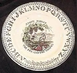 The illustrations from Croxall's editions were an early inspiration for other artefacts aimed at children. In the 18th century they appear on tableware from the Chelsea, Wedgwood and Fenton potteries, for example.[99] 19th century examples with a definitely educational aim include the fable series used on the alphabet plates issued in great numbers from the Brownhills Pottery in Staffordshire. Fables were used equally early in the design of tiles to surround the nursery fireplace. The latter were even more popular in the 19th century when there were specially designed series from Mintons,[100] Minton-Hollins and Maw & Co. In France too, well-known illustrations of La Fontaine's fables were often used on china.[101]