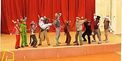 A different strategy is to adapt the telling to popular musical genres. Australian musician David P Shortland chose ten fables for his recording Aesop Go HipHop (2012), where the stories are given a hip hop narration and the moral is underlined in a lyrical chorus.[143] The American William Russo's approach to popularising his Aesop's Fables (1971) was to make of it a rock opera.[144] This incorporates nine, each only introduced by the narrator before the music and characters take over. Instead of following the wording of one of the more standard fable collections, as other composers do, the performer speaks in character. Thus in "The Crow and the Fox" the bird introduces himself with, "Ahm not as pretty as mah friends and I can't sing so good, but, uh, I can steal food pretty goddam good!"[145] Other composers who have created operas for children have been Martin Kalmanoff in Aesop the fabulous fabulist (1969),[146] David Ahlstom in his one-act Aesop's Fables (1986),[147] and David Edgar Walther with his set of four "short operatic dramas", some of which were performed in 2009 and 2010.[148] There have also been local ballet treatments of the fables for children in the US by such companies as Berkshire Ballet[149] and Nashville Ballet.[150]