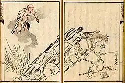 Portuguese missionaries who arrived in Japan at the end of the 16th century introduced the fables to Japan by translating the Latin into Japanese and printing it in latin letters. The title was Esopo no Fabulas and dates to 1593. It was soon followed by a fuller translation into a three-volume kanazōshi entitled Isopo Monogatari (伊曾保 物語).[38] This was the sole Western work to survive after the expulsion of Westerners from Japan, since by that time the figure of Aesop had been acculturated and presented as if he were Japanese.[39] Coloured woodblock editions of individual fables were made by Kawanabe Kyosai in the 19th century.[40]