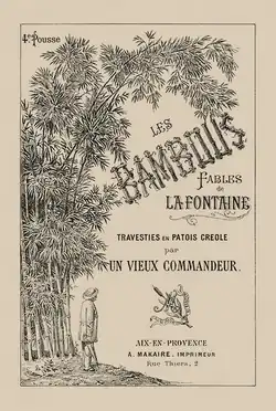 French-based creole languages saw a flowering of such adaptations from the middle of the 19th century onward – initially as part of the colonialist project but later as an assertion of love for and pride in the dialect. A version of La Fontaine's fables in the dialect of Martinique was made by François-Achille Marbot (1817–1866) in Les Bambous, Fables de la Fontaine travesties en patois créole (Port Royal, 1846)[67] which had lasting success. As well as two later editions in Martinique, there were two more published in France in 1870 and 1885 and others in the 20th century.[68] Later dialect fables by Paul Baudot (1801–1870) from neighbouring Guadeloupe owed nothing to La Fontaine, but in 1869 some translated examples did appear in a grammar of Trinidadian French creole written by John Jacob Thomas. Then the start of the new century saw the publication of Georges Sylvain's Cric? Crac! Fables de la Fontaine racontées par un montagnard haïtien et transcrites en vers créoles (La Fontaine's fables told by a Haiti highlander and written in creole verse, 1901).[69]