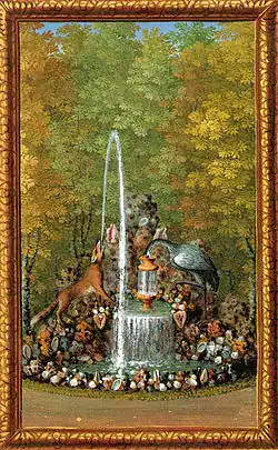 That young people are a special target for the fables was not a particularly new idea and a number of ingenious schemes for catering to that audience had already been put into practice in Europe. The Centum Fabulae of Gabriele Faerno was commissioned by Pope Pius IV in the 16th century 'so that children might learn, at the same time and from the same book, both moral and linguistic purity'. When King Louis XIV of France wanted to instruct his six-year-old son, he incorporated the series of hydraulic statues representing 38 chosen fables in the labyrinth of Versailles in the 1670s. In this he had been advised by Charles Perrault, who was later to translate Faerno's widely published Latin poems into French verse and so bring them to a wider audience.[85] Then in the 1730s appeared the eight volumes of Nouvelles Poésies Spirituelles et Morales sur les plus beaux airs, the first six of which incorporated a section of fables specifically aimed at children. In this the fables of La Fontaine were rewritten to fit popular airs of the day and arranged for simple performance. The preface to this work comments that 'we consider ourselves happy if, in giving them an attraction to useful lessons which are suited to their age, we have given them an aversion to the profane songs which are often put into their mouths and which only serve to corrupt their innocence.'[86] The work was popular and reprinted into the following century.
