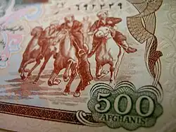 Afs. 500 | 151 × 66 mm | Purple | Seal of Da Afghanistan Bank, Buzkashi players | Bala Hissar fortress | |