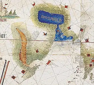 Map of the Arabian Peninsula showing the Red Sea with Socotra island (red) and the Persian Gulf (blue) with the Strait of Hormuz (Cantino planisphere, 1502)