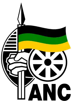 The logo of the ANC incorporates a spear and shield – symbolising the historical and ongoing struggle, armed and otherwise, against colonialism and racial oppression – and a wheel, which is borrowed from the 1955 Congress of the People campaign and therefore symbolises a united and non-racial movement for freedom and equality.[115] The logo uses the same colours as the ANC flag, which comprises three horizontal stripes of equal width in black, green and gold. The black symbolises the native people of South Africa; the green represents the land of South Africa; and the gold represents the country's mineral and other natural wealth.[115] The black, green and gold tricolour also appeared on the flag of the KwaZulu bantustan and appears on the flag of the ANC's rival, the IFP; and all three colours appear in the post-apartheid South African national flag.