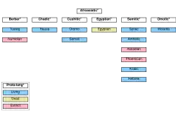 A diagram of the six widely recognized branches of the Afroasiatic family, including some of the larger or more culturally significant languages in each branch.