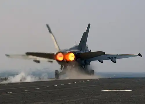 Jet-engine thrust is an application of Newton's reaction principle, in which the engine generates thrust because it increases the momentum of the air passing through it.[5] Thrust depends on two things: the velocity of the exhaust gas and the mass of the gas exiting the nozzle. A jet engine can produce more thrust by either accelerating the gas to a higher velocity or ejecting a greater mass of gas from the engine.[6] Designing a basic turbojet engine around the second principle produces the turbofan engine, which creates slower gas, but more of it. Turbofans are highly fuel efficient and can deliver high thrust for long periods of time, but the design tradeoff is a large size relative to the power output. Generating increased power with a more compact engine for short periods can be achieved using an afterburner. The afterburner increases thrust primarily by accelerating the exhaust gas to a higher velocity.[7]