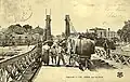 With the transition to the steam engine, the port of Agde became a shipping point for foodstuffs, it was connected to the railway on a state planning decision concerning the Canal du Midi;[20] The floating bridges before the suspension iron bridge 1836 are the solution to the overflow of the Hérault (the entry carries a tax for 9 years).[21] The episcopal palace is cut in two for the passage of the bridge - the right part became the actual Hôtel de la Galiote, the left part the gendarmerie and the prison (which were demolished in 1982) -.[22]