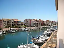 The main marina (Port) was designed next to the location of the cape small fishing port (Cap d'Agde). It replaces the former salt marsh, in use 1912–1916.[37] The fishing port of the Hérault river has been modernised with its professional fish market hall.[38] The river's shipyards, which are mixed with pleasure boats and small fishing boats, succeeded the wooden boat yards. "1960: The president's plan is actually to make from the coast of Occitania the "French Florida".[39][40]
