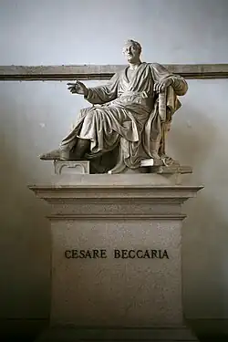 Beccaria, a jurist, criminologist, philosopher, and politician and one of the great Enlightenment writers, became famous for his masterpiece Dei delitti e delle pene (Of Crimes and Punishments, 1764). His treatise, translated into 22 languages,[58] condemned torture and the death penalty and was a founding work in the field of penology and the classical school of criminology by promoting criminal justice. Francesco Mario Pagano wrote studies such as Saggi politici (Political Essays, 1783); and Considerazioni sul processo criminale (Considerations on the Criminal Trial, 1787), which established him as an international authority on criminal law.[59]