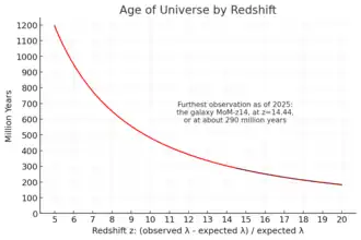 - ^ a b Planck Collaboration (2020). "Planck 2018 results. VI. Cosmological parameters". Astronomy & Astrophysics. 641. page A6 (see PDF page 15, Table 2: "Age/Gyr", last column). arXiv:1807.06209. Bibcode:2020A&A...641A...6P. doi:10.1051/0004-6361/201833910. S2CID 119335614.