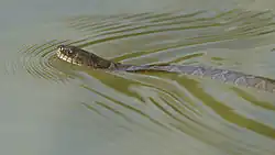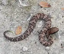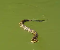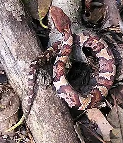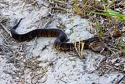Agkistrodon piscivorus is a species of venomous snake, a pit viper in the subfamily Crotalinae of the family Viperidae. It is one of the world's few semiaquatic vipers (along with the Florida cottonmouth), and is native to the Southeastern United States.[5] As an adult, it is large and capable of delivering a painful and potentially fatal bite. When threatened, it may respond by coiling its body and displaying its fangs.[6] Individuals may bite when feeling threatened or being handled in any way.[7] It tends to be found in or near water, particularly in slow-moving and shallow lakes, streams, and marshes. It is a capable swimmer, and like several species of snakes, is known to occasionally enter bays and estuaries and swim between barrier islands and the mainland.[8]: 211 p.
