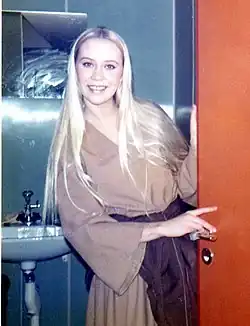 Fältskog wrote her first song at the age of six, titled "Två små troll" ("Two Small Trolls").[17] In 1958, she began taking piano lessons, and also sang in a local church choir.[13] In early 1960, Fältskog formed a musical trio, the Cambers, with her friends Lena Johansson and Elisabeth Strub. They performed locally in minor venues but soon dissolved due to lack of work.[13] Fältskog's first professional engagement came after she was taken on by a local dance band at the age of 15, following which she left school and worked as a telephonist whilst also performing with the band.[18][2]