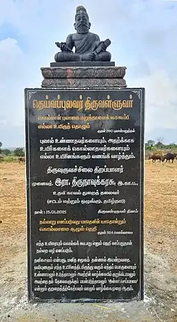 The 5th-century CE Tamil scholar Valluvar, in his Tirukkural, taught ahimsa and moral vegetarianism as personal virtues. The plaque in this statue of Valluvar at an animal sanctuary at Tiruvallur describes the Kural's teachings on ahimsa and non-killing, summing them up with the definition of veganism.