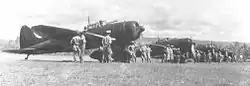 As the war progressed, there were instances when the dive bombers were pressed into duty as fighters in the interceptor role, their maneuverability being enough to allow them to survive in this role.[23] When the Yokosuka D4Y Suisei became available, the D3A2s ended up with land-based units or operating from the smaller carriers, which were too small to handle the fast-landing Suisei. When American forces invaded the Philippines in 1944, land-based D3A2s took part in the fighting but were hopelessly outdated and losses were heavy. By then, many D3A1s and D3A2s were operated by training units in Japan, and several were modified with dual controls as Navy Type 99 Bomber Trainer Model 12s (D3A2-K). During the last year of the war, the D3A2s were pressed back into combat for kamikaze missions.[24]