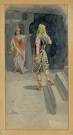 Radamès has been taken into the lower floor of the temple and sealed up in a dark vault, where he thinks that he is alone. As he hopes that Aida is in a safer place, he hears a sigh and then sees Aida. She has hidden herself in the vault in order to die with Radamès (Radamès: "La fatal pietra sovra me si chiuse" / The fatal stone now closes over me). They accept their terrible fate (Radamès: "Morir! Sì pura e bella" / To die! So pure and lovely!) and bid farewell to Earth and its sorrows (duet "Invan! Tutto è finito ... O terra addio").[38] Above the vault in the temple of Ptah, Amneris weeps and prays to the goddess Isis. In the vault below, Aida dies in Radamès' arms as the priests, offstage, pray to the god Ptah. (Chorus, Aida, Radamès, Amneris: "Immenso Ftha" / Almighty Ptah).