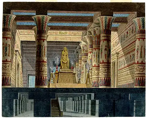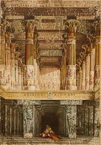 Aida met with great acclaim when it finally opened in Cairo on 24 December 1871. The costumes and accessories for the première were designed by Auguste Mariette, who also oversaw the design and construction of the sets, which were made in Paris by the Opéra's scene painters Auguste-Alfred Rubé and Philippe Chaperon (acts 1 and 4) and Édouard Desplechin and Jean-Baptiste Lavastre (acts 2 and 3), and shipped to Cairo.[8] Although Verdi did not attend the premiere in Cairo, he was most dissatisfied with the fact that the audience consisted of invited dignitaries, politicians and critics, but no members of the general public.[9] He therefore considered the Italian (and European) première, held at La Scala, Milan on 8 February 1872, and a performance in which he was heavily involved at every stage, to be its real première.