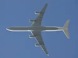 The A300B11,[6] a derivative of the A310, was designed upon the availability of "ten ton" thrust engines.[7] Using four engines, it would seat between 180 and 200 passengers, and have a range of 6,000 nautical miles (11,000 km; 6,900 mi).[8] It was deemed a replacement for the less-efficient Boeing 707s and Douglas DC-8s still in service.[7] The A300B11 was joined by another design, the A300B9, which was a larger derivative of the A300. The B9 was developed by Airbus from the early 1970s at a slow pace until the early 1980s. It was essentially a stretched A300 with the same wing, coupled with the most powerful turbofan engine available at the time.[7] It was targeted at the growing demand for high-capacity, medium-range, transcontinental trunk routes.[7] The B9 offered the same range and payload as the McDonnell Douglas DC-10, but it used between 25%[7] and 38%[9] less fuel. The B9 was therefore considered a replacement for the DC-10 and the Lockheed L-1011 Tristar.[10]