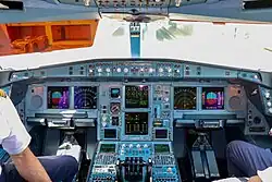 The A340 uses a modified A320 glass cockpit, with side-stick controls instead of a conventional yoke. The main instrument panel is dominated by six displays, cathode-ray tube monitors initially then liquid crystal displays.[68] Flight information is directed via the Electronic Flight Instrument System (EFIS) and systems information through the Electronic Centralised Aircraft Monitor (ECAM).[80][81]