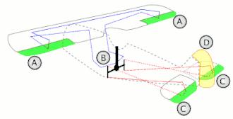In active flow control systems, forces in vehicles occur via circulation control, in which larger and more complex mechanical parts are replaced by smaller, simpler fluidic systems (slots which emit air flows) where larger forces in fluids are diverted by smaller jets or flows of fluid intermittently, to change the direction of vehicles.[21][22] In this use, active flow control promises simplicity and lower mass, costs (up to half less), and inertia and response times. This was demonstrated in the Demon UAV, which flew for the first time in the UK in September 2010.[23]